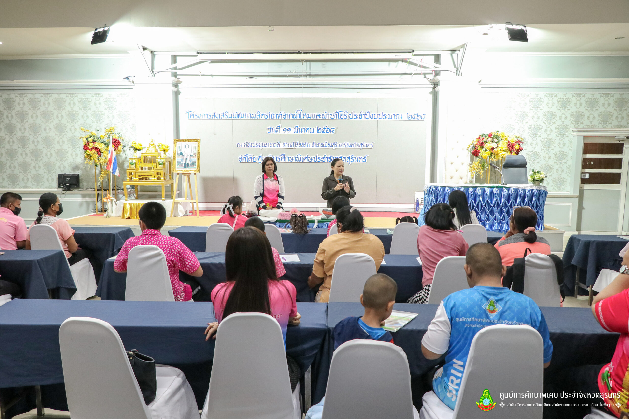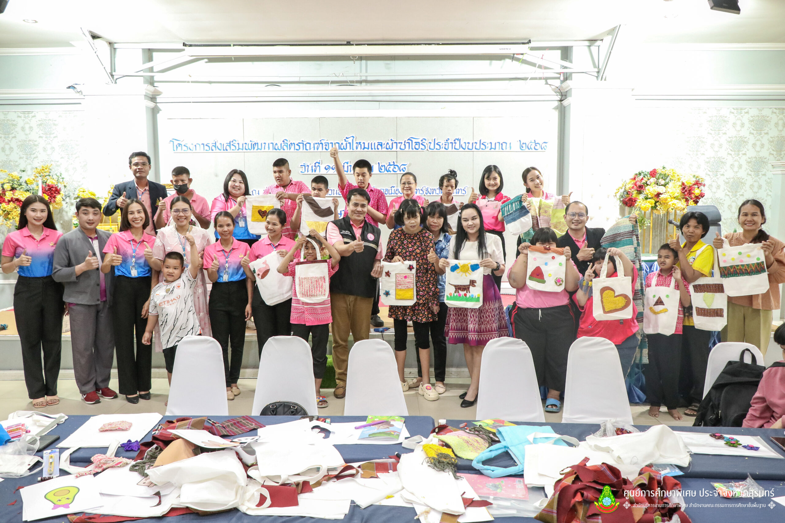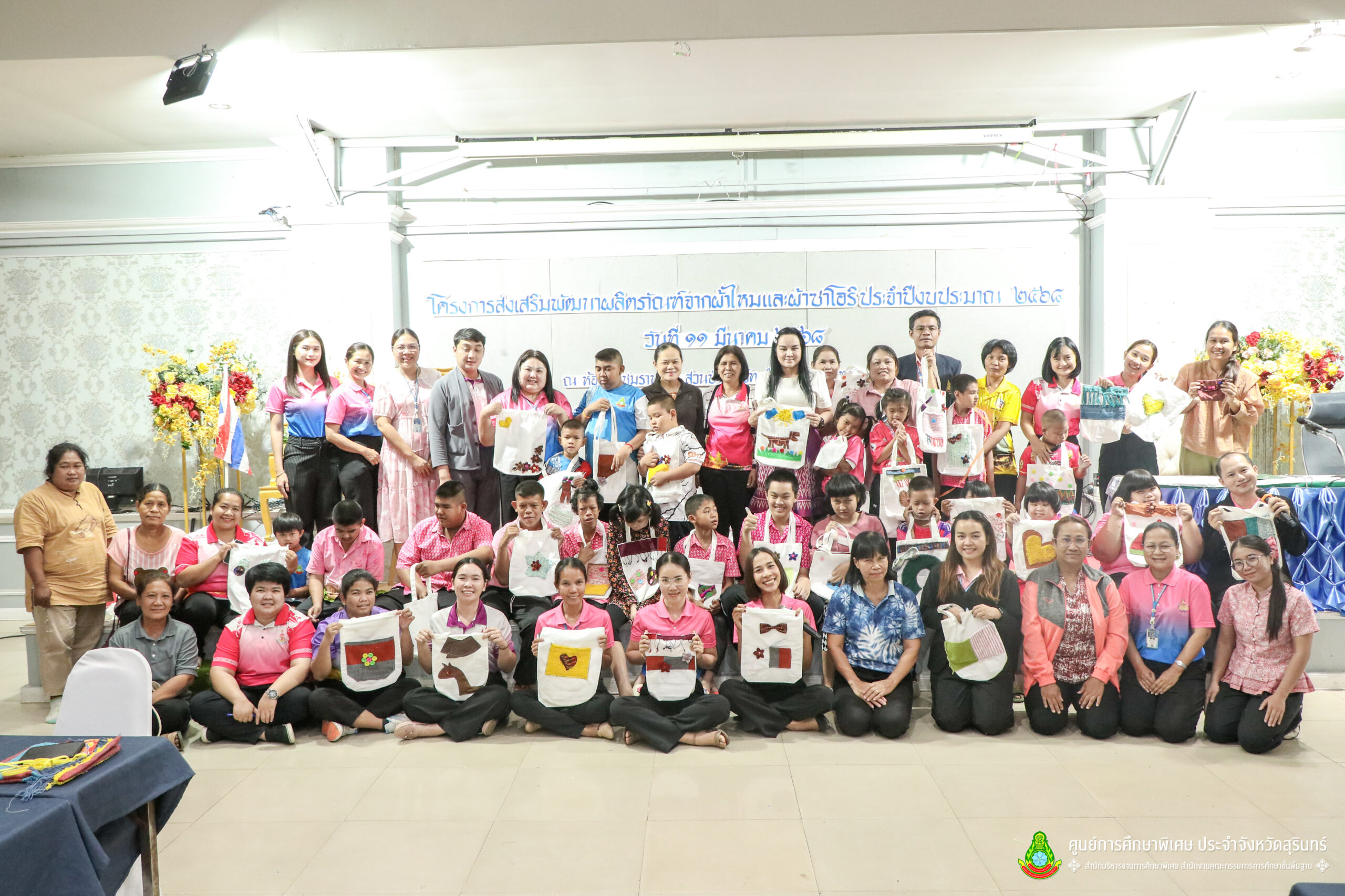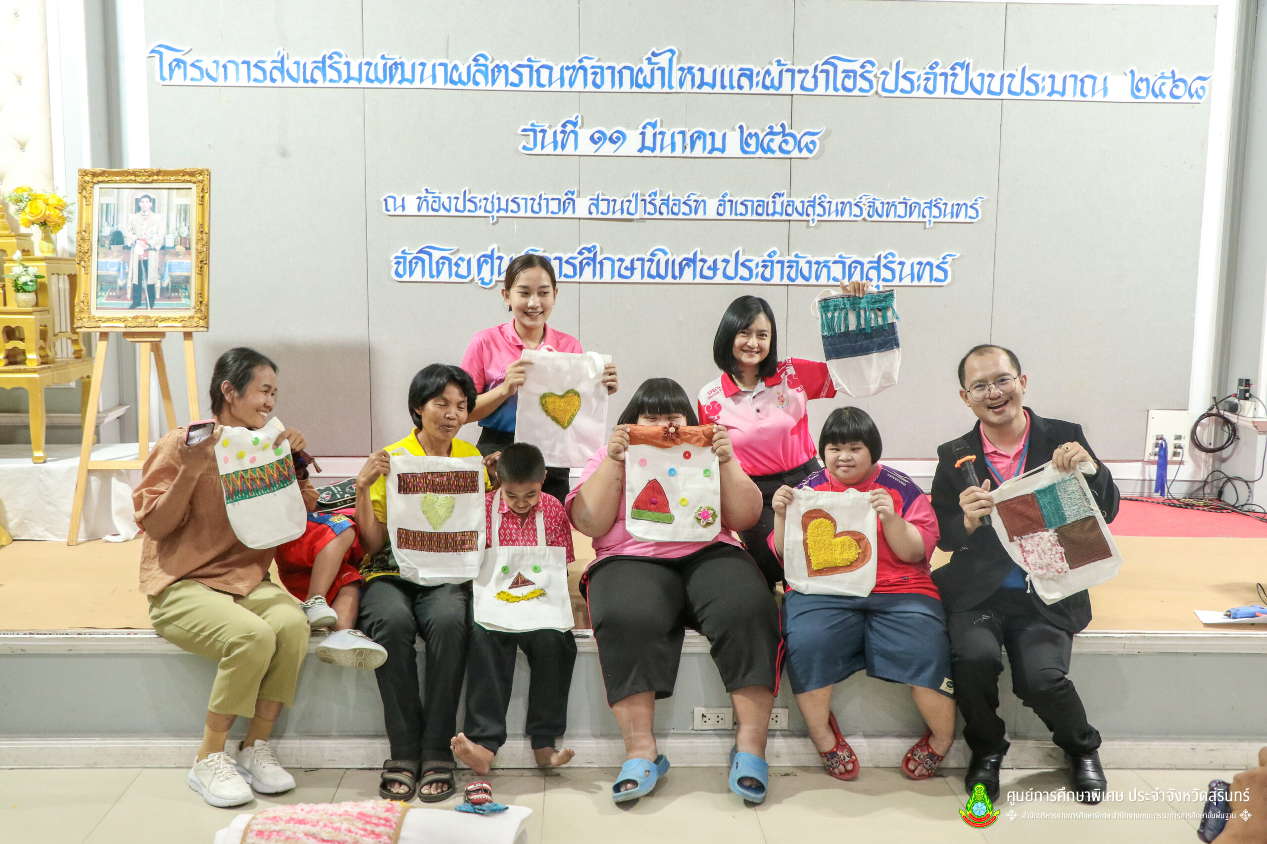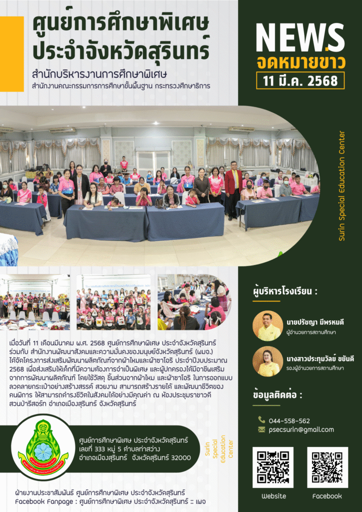 เมื่อวันที่ 11 เดือนมีนาคม พ.ศ. 2568 ศูนย์การศึกษาพิเศษ ประจำจังหวัดสุรินทร์ ร่วมกับ สำนักงานพัฒนาสังคมและความมั่นคงของมนุษย์จังหวัดสุรินทร์ (พมจ.) ได้จัดโครงการส่งเสริมพัฒนาผลิตภัณฑ์จากผ้าไหมและผ้าซาโอริ ประจำปีงบประมาณ 2568 เพื่อส่งเสริมให้เด็กที่มีความต้องการจำเป็นพิเศษ และผู้ปกครองได้มีอาชีพเสริม จากการพัฒนาผลิตภัณฑ์ โดยใช้วัสดุ ชิ้นส่วนจากผ้าไหม และผ้าซาโอริ ในการออกแบบลวดลายกระเป๋าอย่างสร้างสรรค์ สวยงาม สามารถสร้างรายได้ และพัฒนาชีวิตของ คนพิการ ให้สามารถดำรงชีวิตในสังคมได้อย่างมีคุณค่า ณ ห้องประชุมราชาวดี สวนป่ารีสอร์ท อำเภอเมืองสุรินทร์ จังหวัดสุรินทร์
