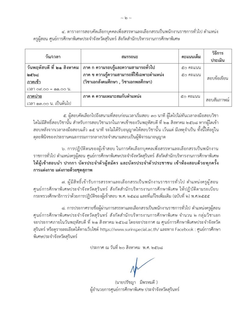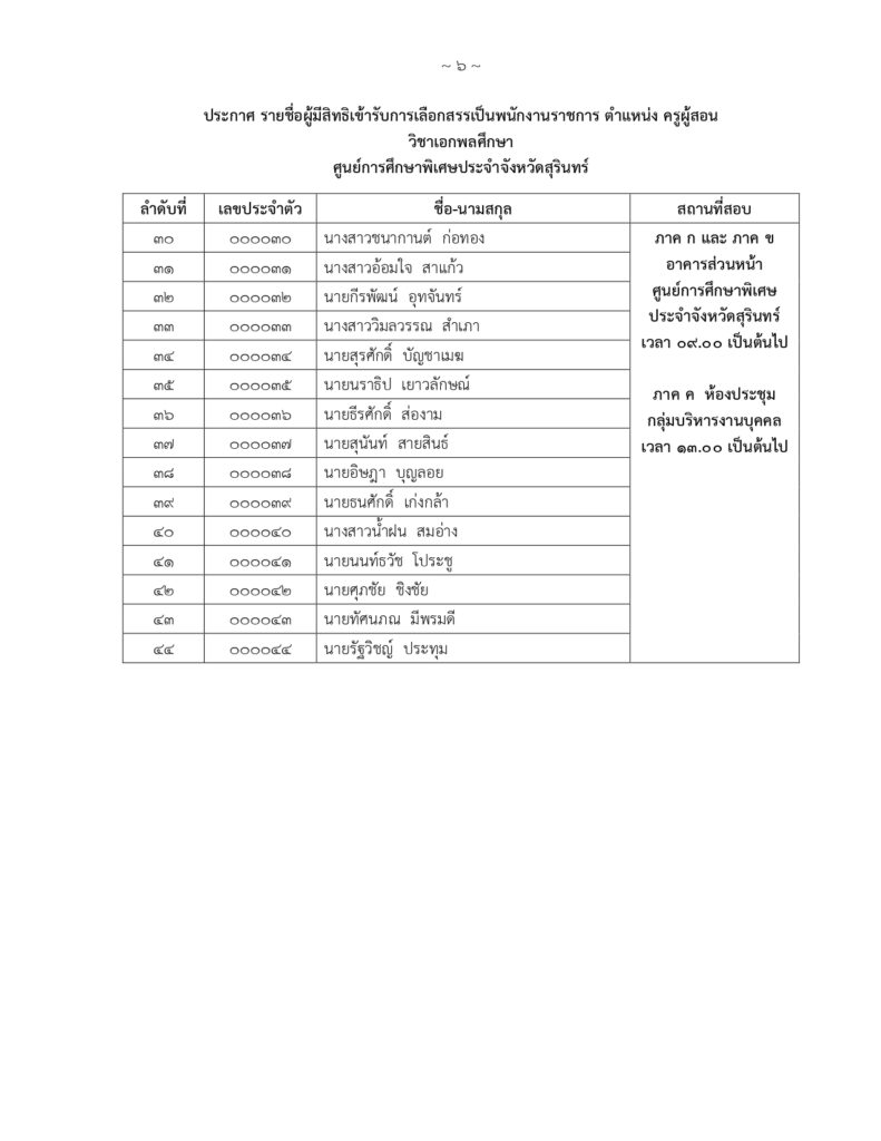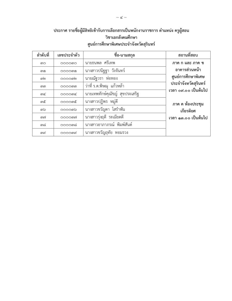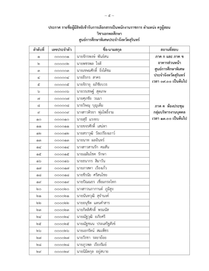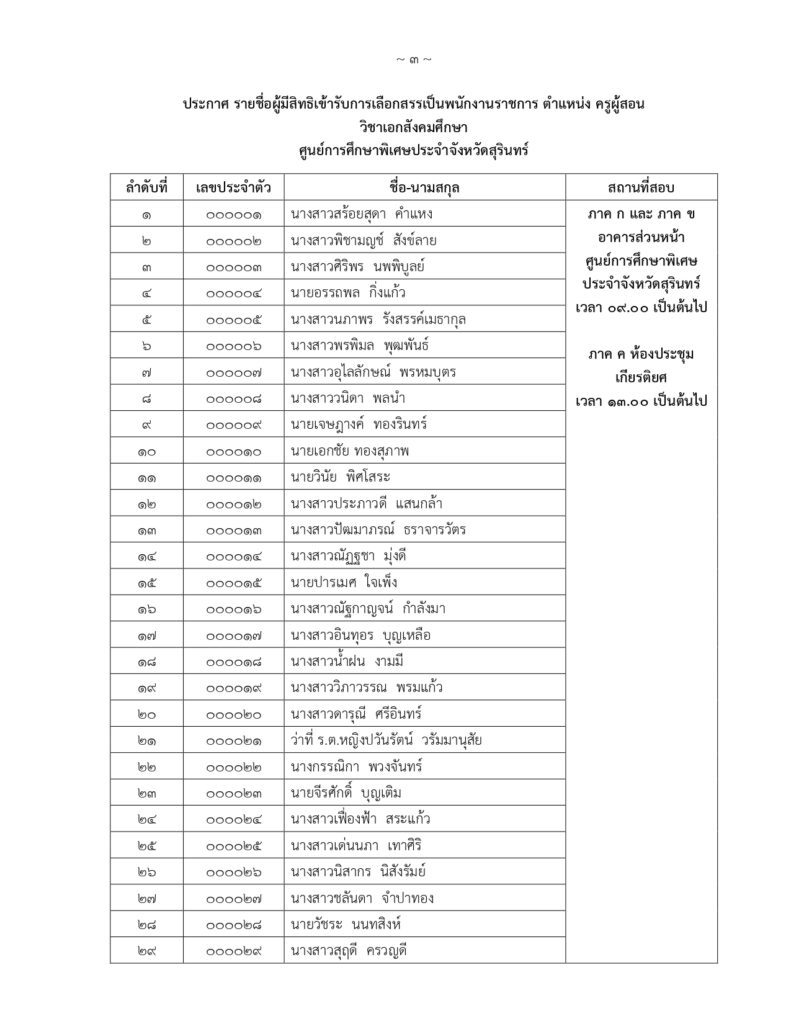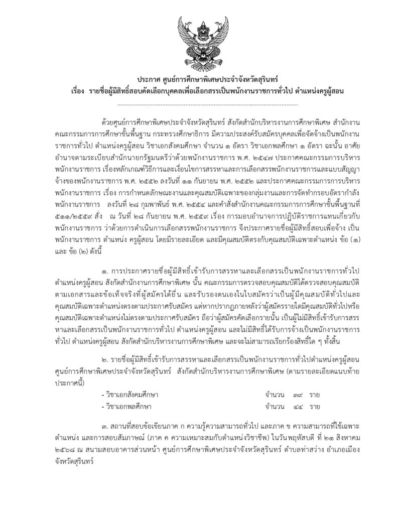 รายชื่อผู้มีสิทธิ์สอบคัดเลือกบุคคลเพื่อจ้างเหมาบริการ ตำแหน่ง พี่เลี้ยงเด็กพิการ ปฏิบัติงาน ณ หน่วยบริการสำโรงทาบ อำเภอสำโรงทาบ จังหวัดสุรินทร์By Psecsurin / 22 เมษายน 2025 ประกาศศูนย์การศึกษาพิเศษ ประจำจังหวัดสุรินทร์เรื่อง รายชื่อผู้มีสิทธิ์สอบคัดเลือกบุคคลเพื่อเลือกสรรเป็นพนักงานราชการทั่วไป ตำแหน่งครูผู้สอน