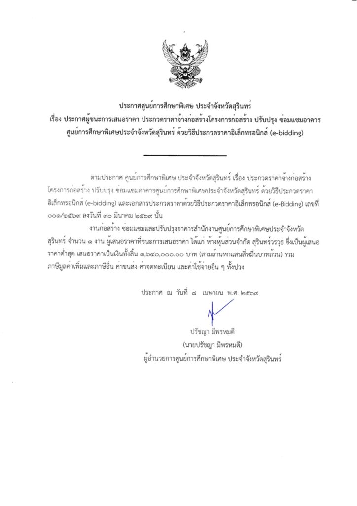 ประกาศผู้ชนะการเสนอราคา ประกวดราคาจ้างก่อสร้างโครงสร้างก่อสร้าง ปรับปรุง ซ่อมแซมอาคาร ศูนย์การศึกษาพิเศษ ประจำจังหวัดสุรินทร์ ด้วยวิธีประกวดราคาอิเล็กทรอนิกส์ (e-bidding)By Psecsurin / 10 เมษายน 2026 ประกาศศูนย์การศึกษาพิเศษ ประจำจังหวัดสุรินทร์เรื่อง ประกาศผู้ชนะการเสนอราคา ประกวดราคาจ้างก่อสร้างโครงสร้างก่อสร้าง ปรับปรุง ซ่อมแซมอาคาร ศูนย์การศึกษาพิเศษ ประจำจังหวัดสุรินทร์ ด้วยวิธีประกวดราคาอิเล็กทรอนิกส์ (e-bidding) Loading... Taking too long? Reload document | Open in new tab